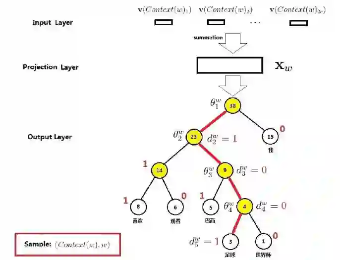 下面通过一个示例说明运算原理,如下图所示,考虑当前词 =“足球”,那么图中的红色边串起来的5个结点就构成路径 ,其长度 ,是路径 的5个结点,其中 对应的是根结点, 分别是1,0,0,1,即当前词“足球”的Huffman编码为1001, 分别是路径 上4个非叶子结点对应的向量。
