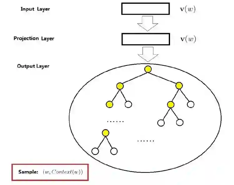 输出层:输出是一个用语料中出现的词为叶子结点构建的Huffman树,结点的权值是各词在语料中出现的次数。图中的Huffman树共 个结点,对应语料中的 个词,非叶子结点 个,即图中标黄的。