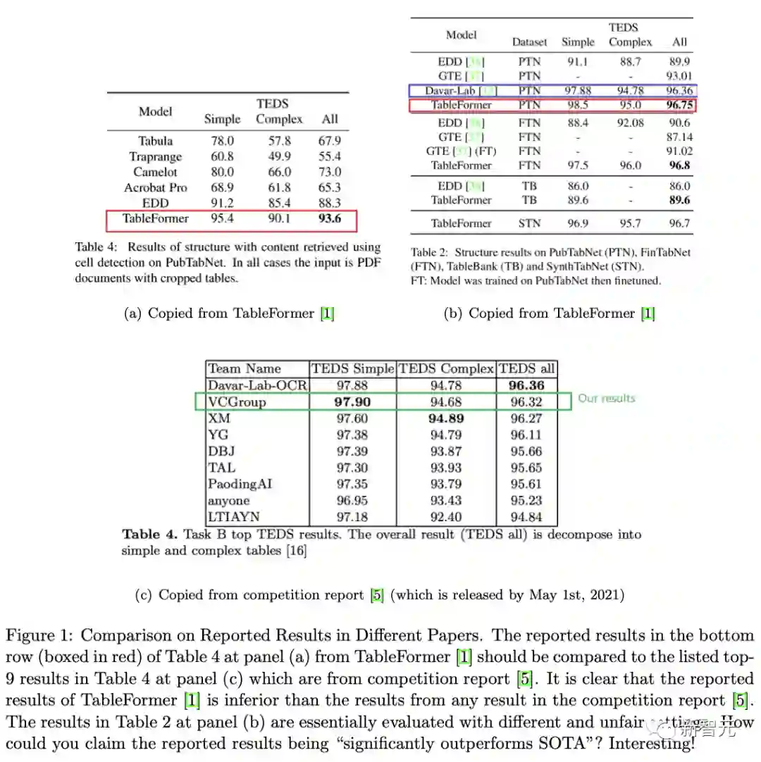 可以看出,(b)中表的2在性能评估的设置上并不公平。具体来说,(c)中表4所有结果都是针对整个表的内容进行评估的,包括表的结构和内容;而(b)中表2的TableFormer和其他结果,除了Davar-Lab,都是针对表的结构进行评估的。把它们混在一个表中,是对性能的比较是一种误导。