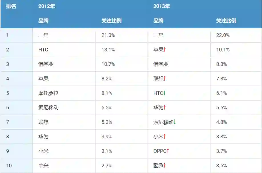 那一年,荣耀仍未独立,依然作为华为手机的附属产品线稳扎稳打的前进着,小米也初步走到了和华为可以互为博弈的对手水平,但当时面对国内手机市场:三星占比21%、HTC13%、诺基亚10%以及苹果8.2%垄断前5名的现状,排名第八的华为和排名的第九的小米,显然有着更加一致的市场和目标。