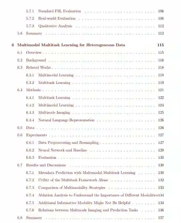 最后,针对异构医疗数据,我们开发了一个多模态多任务学习框架来学习病理元数据预测的共享表示。我们利用多模态融合技术集成幻灯片图像、自由文本和结构化元数据,并采用多任务目标损失来引入学习时的归纳偏差。这比标准的单模态单任务训练设置产生更好的预测能力。我们还应用鲁棒训练技术来学习可以解决两个胸部x射线数据集分布转移的表示。与标准训练相比,我们发现当存在偏移时,鲁棒训练提供了更好的容忍度,并学习了肺病理预测的鲁棒表示。本文的研究并不详尽,但对在有限和异构的医疗数据设置下利用机器学习帮助临床决策进行了广泛的了解。我们还提供了见解和警告,以激发利用低资源和高维医疗数据的机器学习的未来研究方向,并希望对现实世界的临床产生积极的影响。