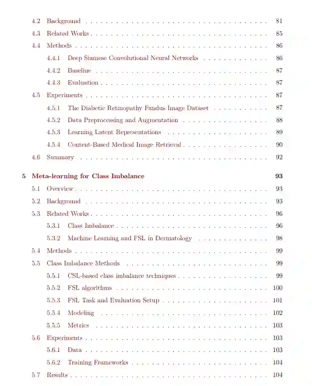 接下来,我们放大数据不平衡问题。本文探索了对比学习的用途,特别是孪生网络,从不平衡的眼底成像数据集中学习表示,用于糖尿病视网膜病变图像检索。与标准的监督学习设置相比,我们使用从Siamese网络学习的表示获得了可比较但可解释的结果。我们还利用极不平衡的长尾皮肤图像数据集进行皮肤病分类的元学习。我们发现,使用元学习模型和使用常规类不平衡技术训练的模型集成可以产生更好的预测性能,特别是对于罕见的皮肤病。