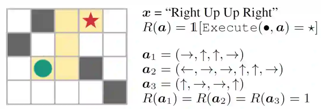作者在两个弱监督语义分析基准任务 WIKITABLEQUESTIONS[12]和 WIKISQL[13]上评估了本文方法。用一个简单的指令跟踪环境进行实验,这个环境是一个大小为 NxN 的简单迷宫,迷宫中随机分布着 K 个致命陷阱。位于迷宫四角之一的球门。具体如图 3。向盲 agent 输入一系列(左、右、上、下)指令。它勾勒出一条最优路径,agent 可以通过该路径达到目标而不被困住。如果 agent 在一定数量的步骤内成功达到目标,则它将获得 1 的奖励,否则为 0。
