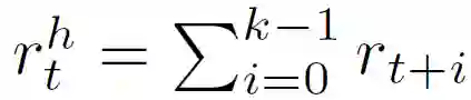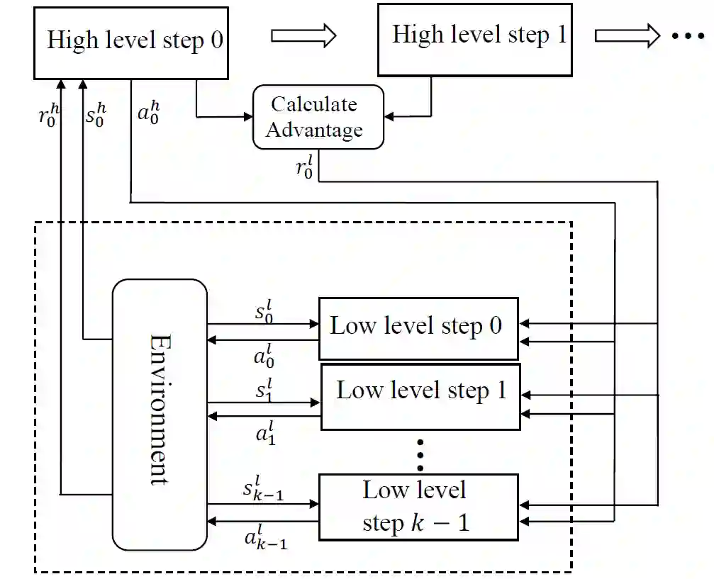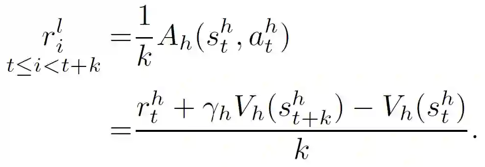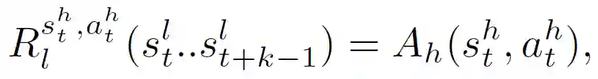 之后,高层政策输出新的动作。高层奖励(r_t)^h 为 k 个步骤的环境反馈累积值: