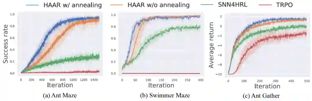 由图 3 的实验结果可以看出,HAAR 明显优于其它基线方法。所有曲线的结果取超过 5 次的平均值,阴影误差条表示 95% 的置信区间。SNN4HRL 在游泳者迷宫任务中的成功率高于蚂蚁迷宫任务,这是因为即使低层的技能没有得到很好的调整,游泳者也不会被绊倒。然而,在游泳者迷宫中,HAAR 仍然优于 SNN4HRL。在不到 200 次迭代之后,HAAR 达到了几乎 100% 的成功率。