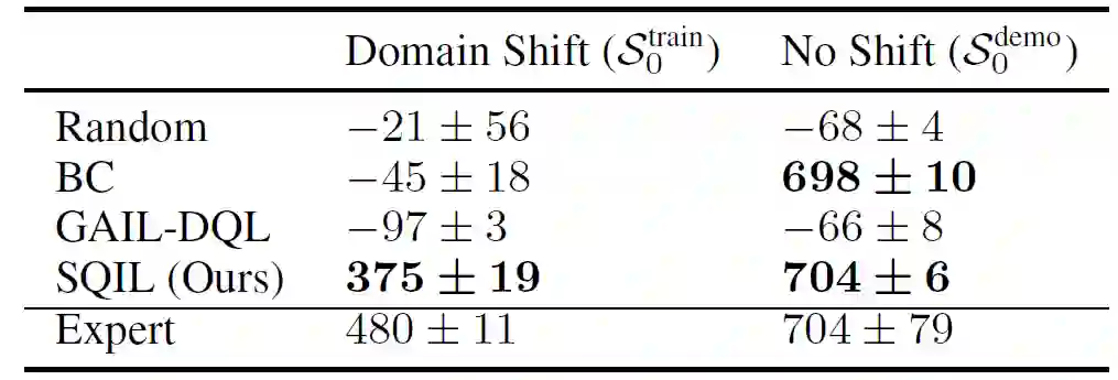 表 1 中的结果显示,当初始状态没有变化时,SQIL 和行为克隆(BC)的表现同样好。该任务非常简单,即使 BC 也能获得高额奖励。在无扰动条件下(右列),尽管 BC 有众所周知的缺点,但 BC 的表现仍大幅超过 GAIL。这表明 GAIL 中的对抗式优化会大幅阻碍学习。当从 S_0^train 开始时,SQIL 的表现比 BC 好得多,表明 SQIL 能够泛化到新的初始状态分布,而 BC 不能。