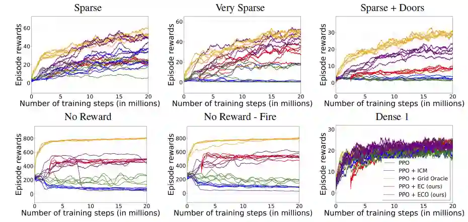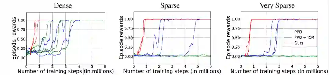 作者发现,即使对于普通的 PPO 算法来说,标准任务「Sparse」其实也是相对容易完成的。原因是 agent 的起点和目标在地图上的采样是相互独立的,例如有时两者恰好在同一个房间,这就简化了任务。由图 6,在使用 20M 4 重复步数的相同环境交互的情况下,本文方法在三个环境中的表现都优于基线方法 PPO+ICM。「Sparse」环境相对简单,所有方法都能合理的完成目标任务。在「Very Sparse」和「Sparse+Doors」的环境下,本文方法相对于 PPO 和 PPO+ICM 的优势更加明显。