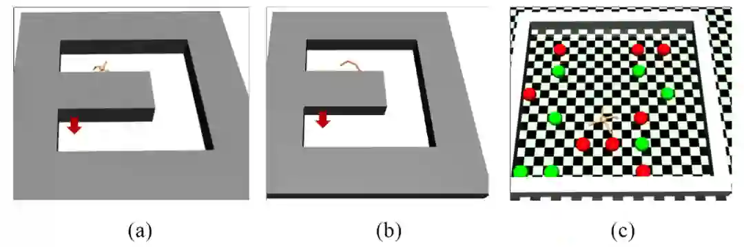 本文使用文献 [8] 提出的基准分层任务进行实验。实验设计的观察空间使得低层技能不受任务的限制,而高层的政策则尽可能的更具普遍性。低层只能访问 agent 存储在 s_l 中的关节角度。这种低层观察的选择需要在预训练阶段获得最少的领域知识,这样才能将技能成功迁移到不同的领域集合中。与其他 HRL 实验不同,agent 无法访问任何直接显示其绝对坐标的信息(x、y 坐标或自顶向下的视图,如 HRL 研究实验中常用的那样)。这使得本文实验中的任务对 agent 来说更难,但缺可以减轻对环境的过度适应,并向 π_h 和 π_l 引入潜在的可迁移性。