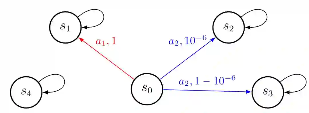 探索的目标是访问所有可能的状态,以便 agent 能够收集足够的信息,以便最终找到最优策略。然而,在马尔可夫决策过程(Markov decision process, MDP)中,无论 agent 采取何种策略,都有可能出现某些状态很难达到的情况。首先,图 1 给出了「重要」状态的概念。图 1 中共 5 个状态,s0 为初始状态。agent 仅能从 s0 迁移到其它状态,无论 agent 采取什么动作其它状态都会消失,也就是都会产生状态转移。对于状态 s0,使用蓝色箭头表示如果采取 a1 行动时的过渡,用红色箭头表示如果采取 a2 行动时的过渡。行动后箭头上的数字是过渡概率。在这个例子中,s4 是不重要的,因为它永远不可能达到。