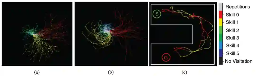 图 4:(a)蚂蚁初始低层技能的可视化图,(b) 蚂蚁迷宫辅助奖励训练后的低层技能,(c) 在蚂蚁迷宫中用 HAAR 训练蚂蚁后的样本轨迹。