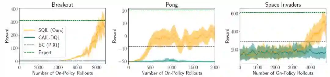 图 1 给出了几个基于图像的任务结果。图 1 中的结果显示,SQIL 在 Pong、Breakout 和 Space Invaders 上的表现优于 BC。BC 存在复合误差,而 SQIL 则没有。