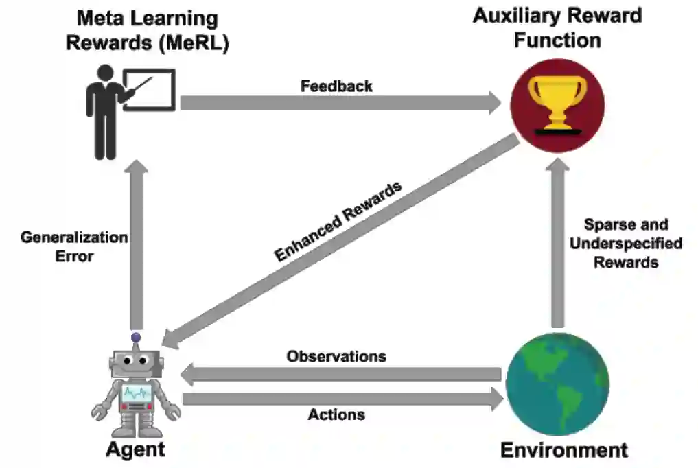 图 2. MeRL 原理图:利用辅助奖励模型得到的奖励信号训练 agent,利用 agent 的泛化误差训练辅助奖励。