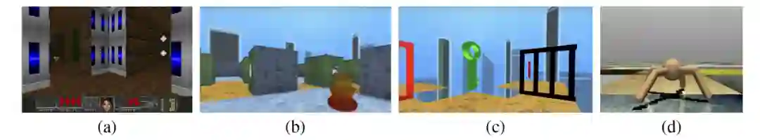 图 4. 实验中考虑的任务实例。(a)VizDoom 静态迷宫目标,(b)DMLab 随机迷宫目标,(c)DMLab 钥匙门谜题,(d)MuJoCo 第一人称视角的好奇心蚂蚁运动。