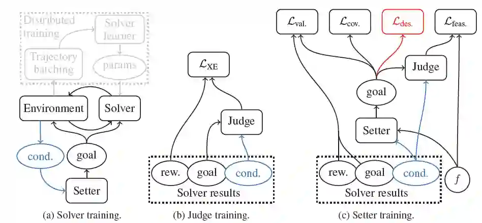 本文模型由三个主要部分组成:解算器(Solver) - 用来训练的目标条件 agent;设定器(Setter,S)—用来为 agent 生成目标课程的生成模型;判断器(Judge,J)—可以预测 agent 目前目标可行性的判别模型。训练机制见图 1。解算器 agent 使用分布式学习设置对设置者生成的目标进行训练,以计算策略梯度。对于设定器训练来说,有三个概念很重要:目标有效性、目标可行性和目标覆盖率。如果存在一个解算器 agent 策略,它实现这个目标的概率是非零,则称这个目标是有效的。这个概念与解算器的现行政策无关。可行性表达了目标目前是否可以由解算器实现。具体来说,如果解算器实现目标的概率为 f,则称该目标具有可行性 f∈[0,1]。因此,可行性目标的集合将随着解算器的学习而演变。判断器是一个可行性的学习模型,通过监督学习对解算器的结果进行训练。最后,目标覆盖率表示设定器产生的目标的可变性(熵)。