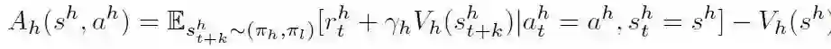 单靠稀疏的环境奖励很难提供足够的监督以使低层技能适应下游任务。本文引入高层优势函数(high-level advantage function)设置低层技能的辅助奖励。针对状态 (s_t)^h 的动作 (a_t)^h 的函数定义为: