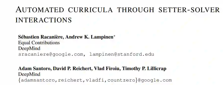 本文是 ICLR 2020 中的一篇文章。文章将课程学习模拟人类教育依赖于课程的概念,通过将任务分解为更简单、静态的挑战,并给予密集的奖励,从而建立起复杂的行为。虽然课程对 agent 也很有用,但手工制作课程很耗时。本文探索在丰富的动态环境中自动生成课程。利用设定者 - 求解者(setter-solver)范式,展示了考虑目标有效性、目标可行性和目标覆盖率对构建有用课程的重要性。