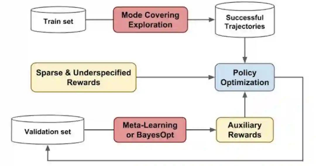 MeRL 在处理未指定奖励时的思路是:实现意外成功的虚假轨迹和程序对 agent 的泛化性能是有害的。为了解决这一问题,MeRL 优化了一个更加复杂的辅助奖励函数,该函数可以根据动作轨迹的特征区分意外成功和有目的成功。通过元学习,在保持验证集上最大化训练代理的性能,优化辅助奖励。图 2 为 MeRL 的原理图示。