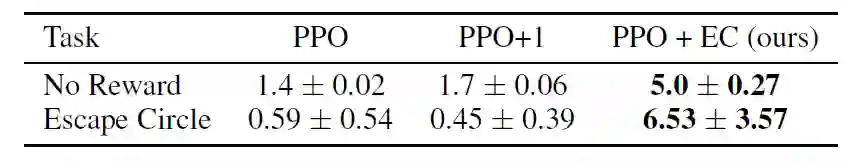 此外,作者还进行了一个实验,任务奖励极其稀少 -- 称之为「Escape Circle」。奖励的发放方式如下:在半径为 10 的圆圈内奖励为 0,从 10 开始,每当 agent 通过半径为 10+0.5k 的同心圆时,给予一次性奖励 1。最终的实验结果见表 1。本文方法明显优于基线(优于最佳基线 10 倍)。