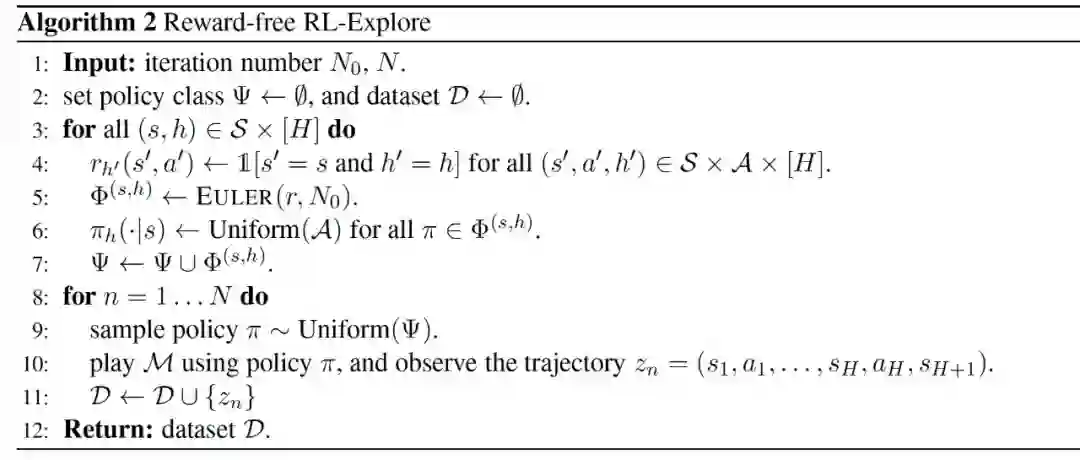 作者在文章中证明了利用算法 2,可以从底层分布μ中收集数据。也就是说,所有重要的状态和动作都会以合理的概率被μ分布所访问。对于步骤 h 的每一个状态 s,算法 2 首先创建一个奖励函数 r,除了步骤 h 的状态 s 之外,这个奖励函数 r 始终为零,然后当 agent 与环境交互时,可以适当地给这个设计好的奖励 r 来模拟一个标准的 MDP。这个奖励 r 的 MDP 的最优策略正是最大化到达(s,h)的概率的策略。本文使用 Euler 算法逼近这个最优政策 [5]。