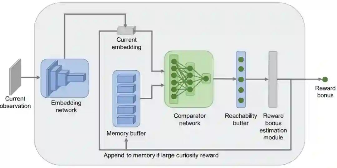 该模块的目的是检查内存中是否有可达到的观测值,如果没有发现,则为当前时间步长分配更大的奖励红利。该检查是通过比较器网络将内存中的嵌入与当前嵌入进行比较。本质上,这种检查保证了在内存中没有任何观测值可以通过从当前状态中只采取几个动作来达到,这也是本文对新颖性(Novelty)的描述。