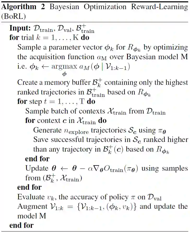 本文提出了两种具体的方法来实现这一思想。(1) 基于基于梯度的 MetaLearning (MAML) (Finn et al., 2017)(算法 1)[2](关于 MAML 算法我们也有介绍);(2) 使用 BayesOpt (Snoek et al., 2012) 作为无梯度黑盒优化器(算法 2)[3]。使用经典 MAML 实现的方法记做 MeRL。作者将使用 BayesOpt 优化算法的方法记做(Bayesian Optimization Reward-Learning, BoRL)。