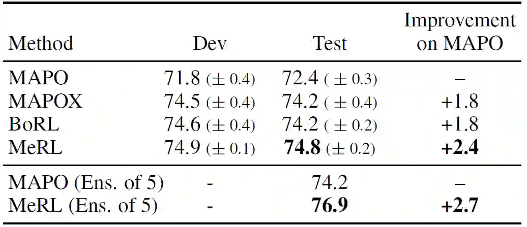 表 1 和表 2 分别给出了两个基准任务上的实验结果。对比算法包括 MAPO[14]以及 MAPOX(IML 的探测能力与 MAPO 的泛化能力相结合)。MeRL 在 WikiTableQuestions 和 WikiSQL 基准上的实验分别比以前的工作提高了 1.2% 和 2.4%。通过执行更好的探索,MAPOX 在两个数据集上的效果都优于 MAPO。此外,MeRL 和 BoRL 在 WIKITABLEQUESTIONS 中的效果都优于 MAPOX。