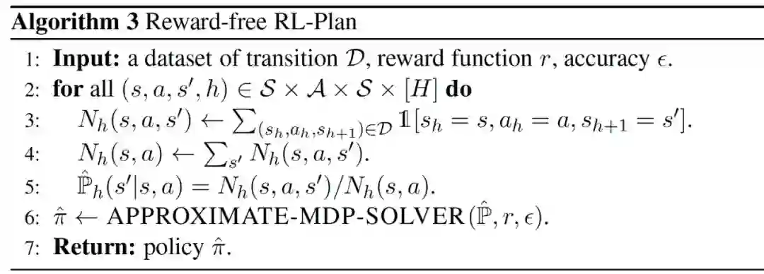 在规划阶段,赋予 agent 奖励函数 r,并根据 r 和探索阶段收集的数据集 D 找到一个接近最优的策略。具体见算法 3。作者在文章中证明了只要探索阶段收集的数据数量足够多,输出策略不仅是具有过渡矩阵的估计 MDP 的近优策略,也是真正 MDP 的近优策略。