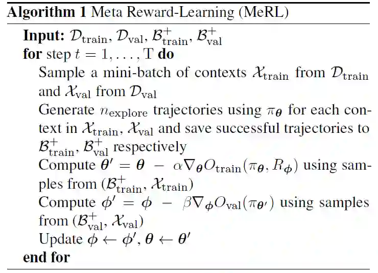 本文是 Google AI 最新发布的一篇文章。本文提出了一种元奖励学习(Meta Reward Learning, MeRL)来解决未指定奖励不足的问题。MeRL 通过优化辅助奖励函数向 agent 提供更精细的反馈。MeRL 引入了一个用于保存成功轨迹(Successful trajectory)的记忆缓存,使用一种新的探索策略来学习稀疏奖励。MeRL 在不使用任何专家演示的情况下自动学习辅助奖励函数,使其能够获得更广泛的应用,这有别于以往的奖励学习方法(例如上一篇分析的文章)。