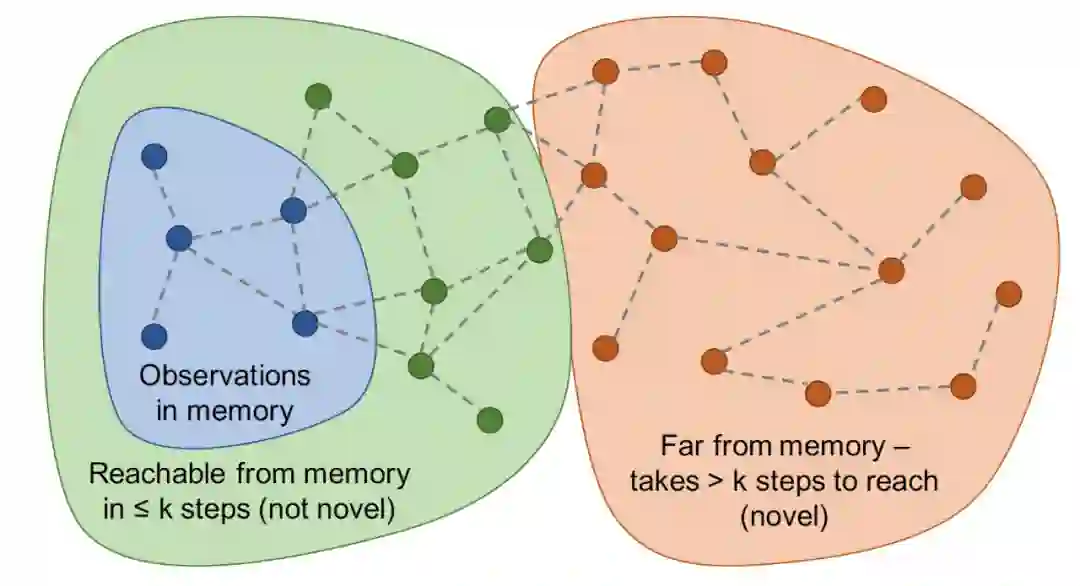本文方法的工作原理如下。Agent 在一个周期(Episode)开始时从一个空的记忆内存开始,在每一步都将当前观察结果与记忆中的观察结果进行比较,以通过可达性来确定新颖性。如果当前观察确实是新颖的,即从记忆中的观察到达到阈值需要更多的步骤,则 agent 会奖励自己并将当前观察添加到记忆内存中。这个过程一直持续到当前周期结束,且将内存清空。