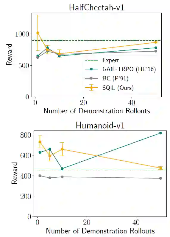 图 2 给出在低维 MuJoCo 中实现连续控制的 SQIL 实例。这个 SQIL 的实例与 MuJoCo 的 Humanoid(17 DoF)和 HalfCheetah(6 DoF)任务的 GAIL 进行了比较。结果显示,SQIL 在这两个任务上的表现都优于 BC,并且与 GAIL 的表现相当,这说明 SQIL 可以成功地部署在具有连续动作的问题上,并且 SQIL 即使在少量演示的情况下也能表现良好。