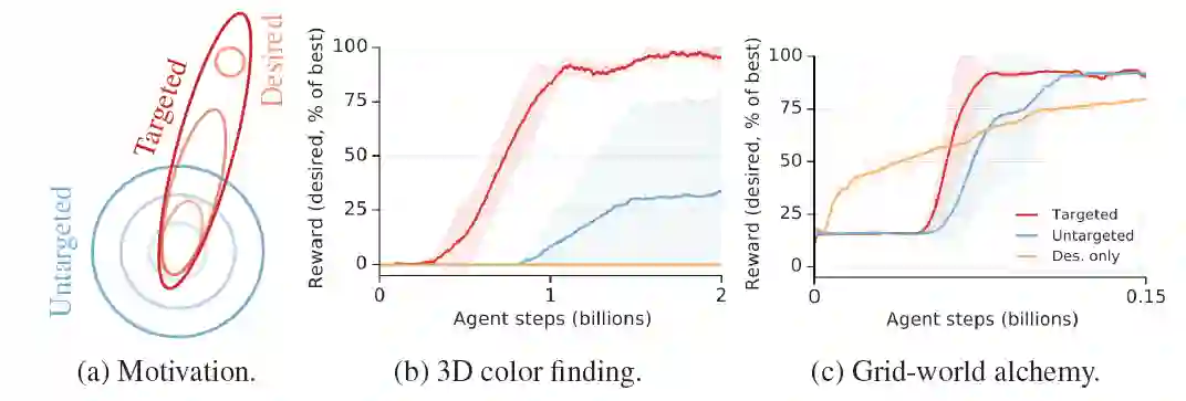 在复杂的任务环境中,通过基于难度的探索来发现期望的行为可能并不可行。一个任务可能有很多困难的方式,其中大部分与最终希望代理实现的目标无关。通过针对期望目标分布与期望目标损失,设定器可以推动解算器更高效地掌握期望任务(图 3a)。作者首先在 3D 寻色环境中进行探索。实验目标是 12 种亮色对的分布。在没有设定器的情况下发现这些亮色对是非常困难的。因此,只对期望的分布进行训练的结果是没有学习。无目标的 setter-solver 设置最终可以学习这些任务。在炼金术任务中,情况有些不同(图 3b)。