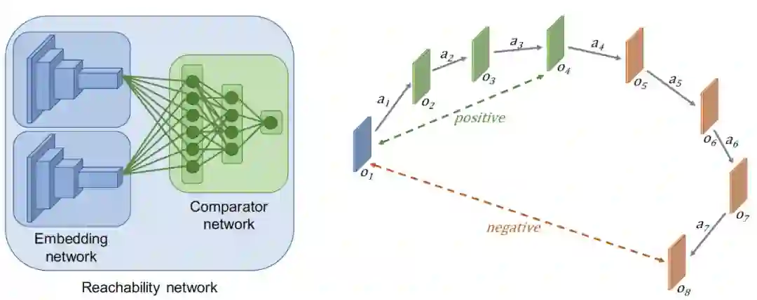 这两个网络被设计成共同作用于估计一个观测值 o_i 从另一个观测值 o_j 作为可达性网络的一部分的在 k 步内可到达的情况: