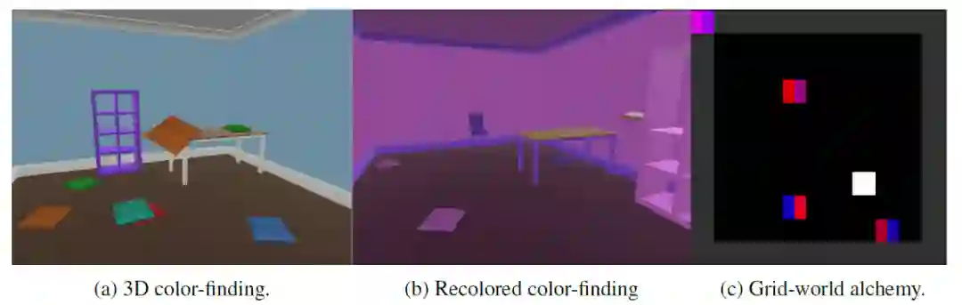 (1)三维寻色(3D color finding)。一个用 Unity(http://unity3d.com)构建的半现实的 3D 环境,由一个包含彩色物体和家具的房间组成(图 2a)。agent 可以移动和查看周围的情况,并可以拿起、操作和放下物体。这就形成了一个复杂的 46 维行动空间。在每个周期开始时,物体和家具被随机放置在房间周围。agent 收到一种颜色(或一对颜色)作为目标,如果在其视图中心的一个 patch(或两个相邻的 patch)包含接近这个目标的平均颜色,就会得到奖励。本文还使用了这种环境的一个扩展版本,其中房间的墙壁、天花板和地板,以及所有的物体,都被程序化地重新着色成每个周期随机选择的两种颜色之一(图 2b)。
