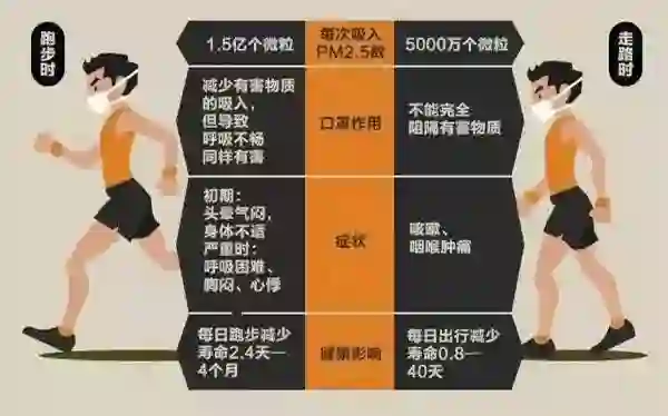 对于雾霾带来的危害,可能没有谁会比中国的城市居民更有发言权。来自《美国医学会杂志》的研究表明,PM2.5会导致动脉斑块沉积,引发血管炎症和动脉粥样硬化,最终导致心脏病或其他心血管问题。一个更为直观的表述是,在雾霾天户外走路2小时,会吸入约5000万个PM2.5微粒,根据污染程度的不同,寿命会减少0.8~40天,而如果选择每天跑步2小时,则会吸入超过1.5亿个PM2.5微粒,寿命最多减少4个月——也就是说,跑步一分钟,寿命少一天。