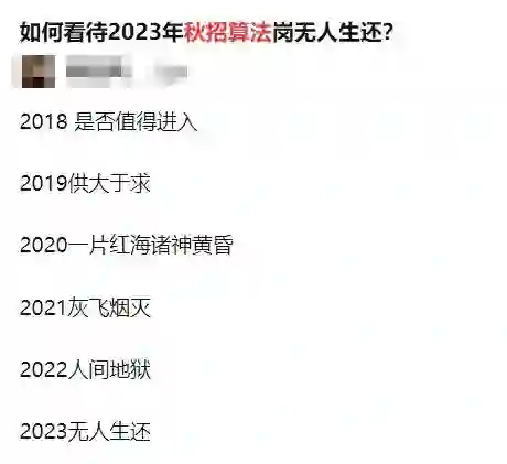 每次刷知乎,总能看到“19年算法岗供大于求”、“20年算法岗诸神黄昏”、“21年算法岗灰飞烟灭”,今年又换了个四字词语 --“人间炼狱”。各路“过来人”也都是全方位劝退。
