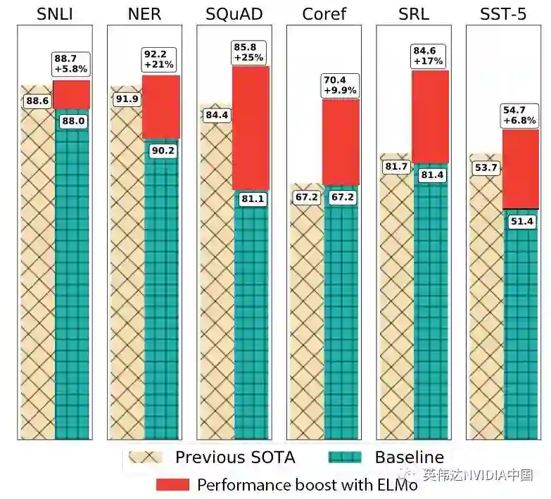 与之前最先进(SOTA)的基准相比,ELMo在六个基准NLP任务中都增强了神经模型的性能。从左到右,这些任务依次是:语义推理、命名实体识别、问题回答、指代消解、语义角色标注和情感分类。