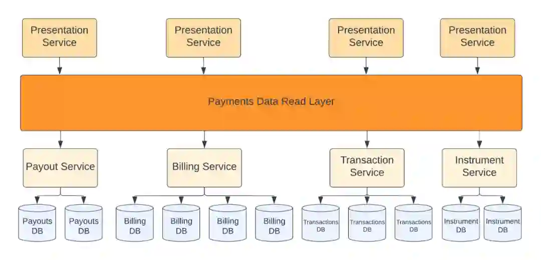 迁移到 SOA 架构后支付数据的读取流程。呈现服务调用一个或多个支付服务,并在应用层聚合数据