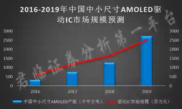 根据预测,国内AMOLED驱动IC市场规模预计将从2016年的5.76亿元上升至2019年的25.1亿元,年复合增长率达63%。