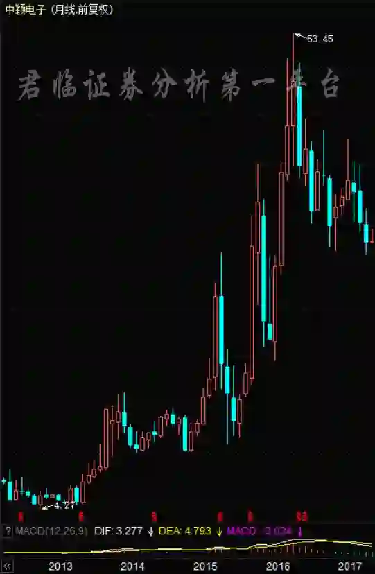 回看中颖电子的股价,你就会惊讶的发现,从上市后没多久的4.27元,至2016年底的53.45元,这个公司的股价已经在3年时间里实现了十倍股的荣耀。