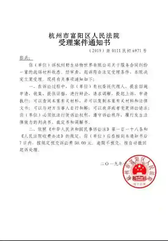 2019年10月28日,郭兵将杭州野生动物世界起诉至法院,请求对方退还1360元的卡费,并承担本案诉讼费。