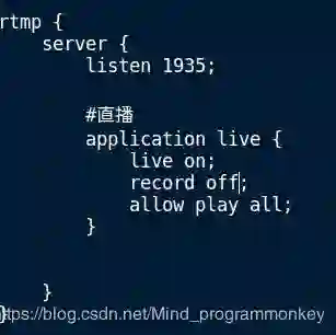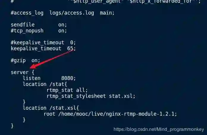 在nginx.conf文件中新增加的下面的内容,增加RTMP功能以及使Nginx能具有直播状态监听的功能: