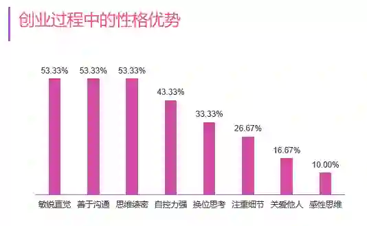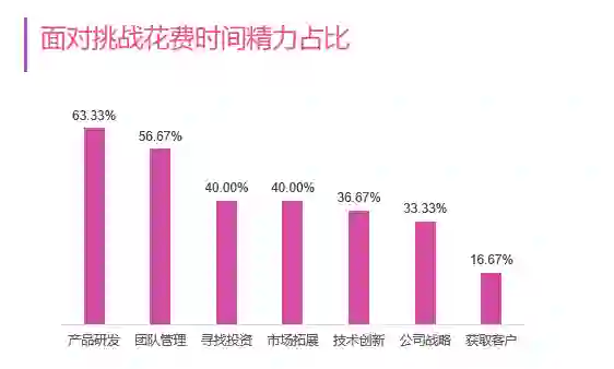 在30位上榜女性看来,女性创业者的性格优势主要有敏锐直觉、善于沟通、思维缜密,三者占比均为53.33%,这样的性格优势让她们在诸如获取客户、公司战略以及技术创新等方面花费的精力相对较少,她们承认某些方面如产品研发、团队管理依然是她们头疼的问题,花费的精力相对较高,占比分别为63.33%和56.67%。