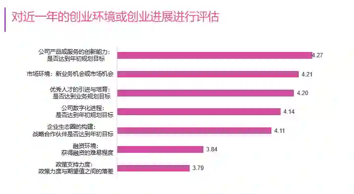 对于当下创业环境及创业进展的评估,30位上榜的女性创业者比较满意是公司产品及服务创新能力,她们给了最高的4.27分(满分5分),对于当前融资环境以及政策支持力度,她们不太满意,评价相对较低。