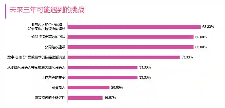 对于“未来三年可能遇到的挑战”,30位上榜女性认为最大的挑战源于“业务收入和企业规模如何实现可持续协同增长”,占比达到63.33%,“公司组织建设”以及“如何打造更高效的团队”亦是女性在创业过程中面临的较大难题,此外,数字化时代下,女性创业者们同样面临着“数字化时代产品或技术创新提速的挑战”。