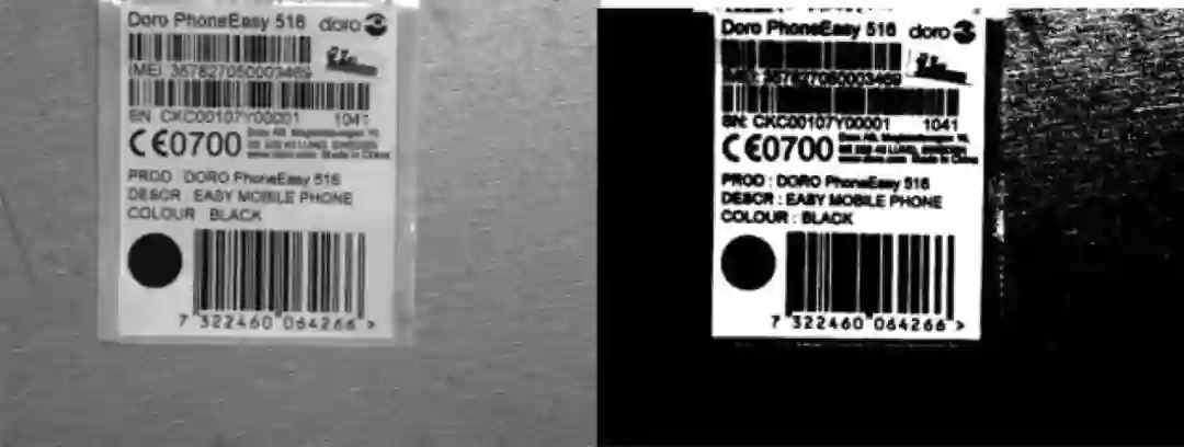1)对光源的摆置要求较高,依赖光源获取对比鲜明的图像,否则将可能出现条码贴纸与背景分割失败的情况;