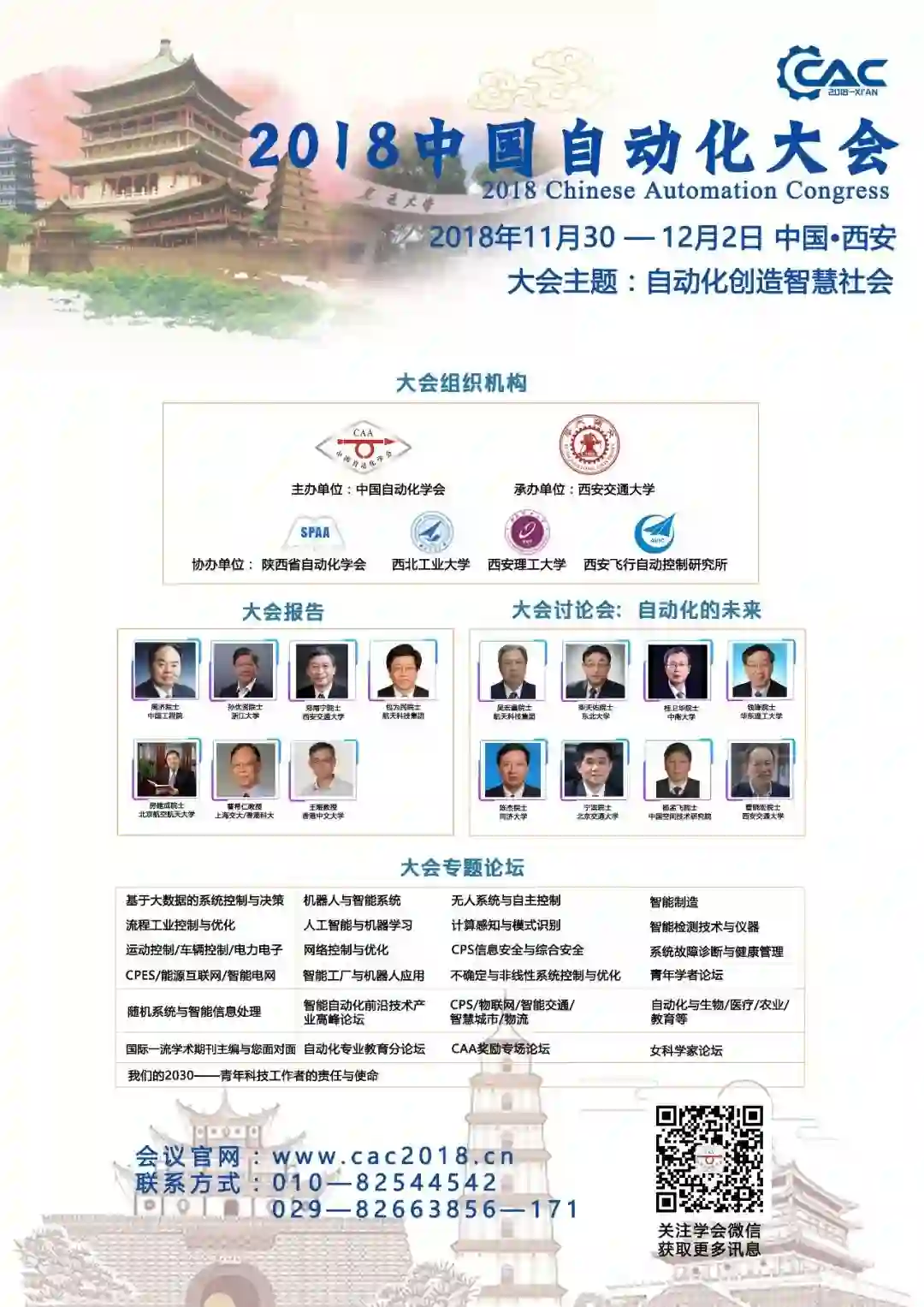 中国自动化大会是由中国自动化学会主办的国内最高层次的自动化、信息与智能科学领域的大型综合性学术会议,2018年中国自动化大会(CAC2018)的主题为“自动化创造智慧社会”,大会将于2018年11月30日至12月2日在西安召开。本次大会由西安交通大学承办。
