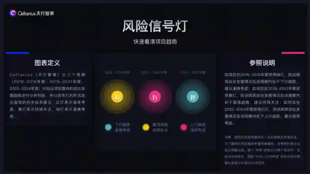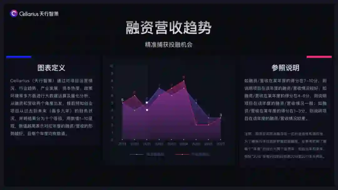 通过算法系统,我们能够复盘及预判出项目发展趋势是处于上行、震荡还是下行,以此快速判断出投资风险是大还是小;该项目在过去及未来的高低起伏也是一目了然的,不仅能够识别出发展的高峰和低谷,而且还能够将业务、融资和营收的情况按照每个年度区分呈现(示意图2)。