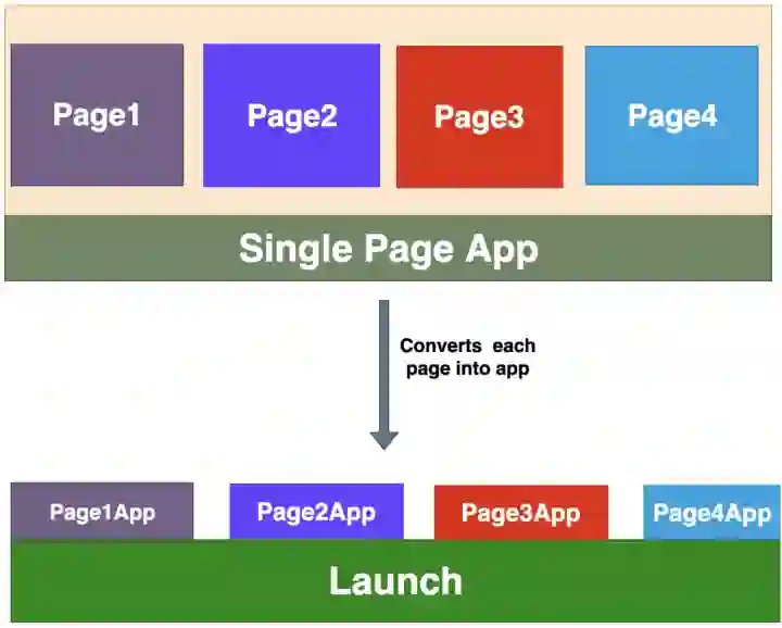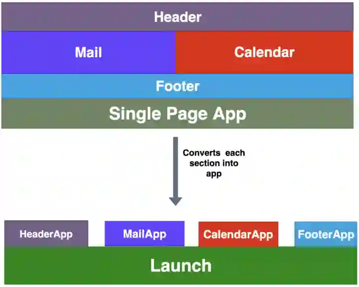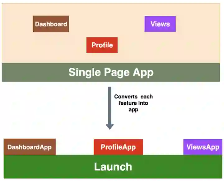 这是最常见的方法,因为我们可以很容易地划分应用的功能。例如,如果应用有三个特性,分别是 Dashboard、Profile 和 Views,我们可以将每个特性作为一个单独的应用,并在 Launch.js 的辅助下在 DOM 中挂载和卸载它们。这个 Launch.js 可以是一个独立的应用,也可以只是一个简单的 JavaScript 应用。