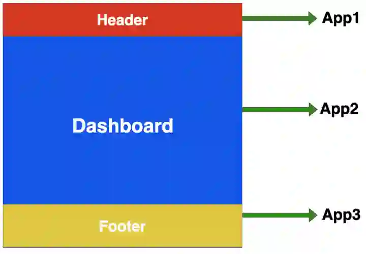 我们将按下图所示,把这个应用分成多个组成部分。我们一共要实现 4 个应用,分别是 HeaderApp、DashboardApp、FooterApp 和根应用。