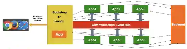 如上图所示,我们有 6 个前端应用互相协作来交付一个更大的应用。这些应用之间的通信可以借助事件总线、window 对象或发布 / 订阅方法来实现。每个应用都可以由不同的团队和任意框架实现。每个应用都可以独立地与其后端或端点进行交互。这里有一个 bootstrap/launch 应用,它会负责加载所有其他的应用,并根据用户的交互或路由在 DOM 中挂载或卸载它们。